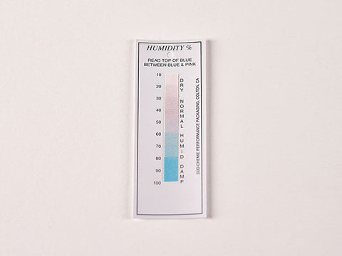 Convenient strips provide an inexpensive and fast method of checking the relatively humidity level of storage and display areas. As humidity levels change, the chemically impregnated spots change from blue (dry) to lavender (normal) to pink (humid).