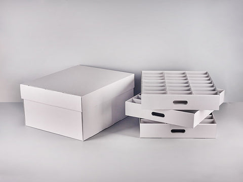 These versatile boxes allow smaller objects to be stored together within the one box. The Single Deck Object box is one third the height of the Triple Deck Object box. Both boxes take the same trays/divider inserts. Divider insert creates 12 separate compartments, each approx 90 x 90 mm. No tape or adhesive is required for assembly. All components are constructed with National Archives-approved corrugated archival board and are 100% Australian made. and can be used without divider inserts if required. Boxes can also be purchased on their own. Custom dividers can be made to fit specific objects such as golf balls, etc.