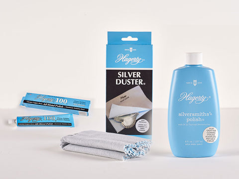 Gentle silver cleaning products with tarnish inhibitors. Strips protect silver from tarnishing by absorbing airborne sulphur. Horsehair brush removes polish & excess oxidation from intricate patterns.